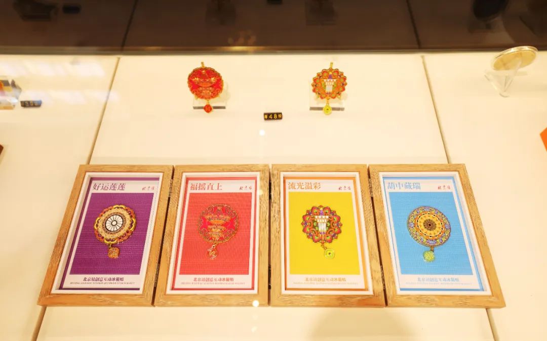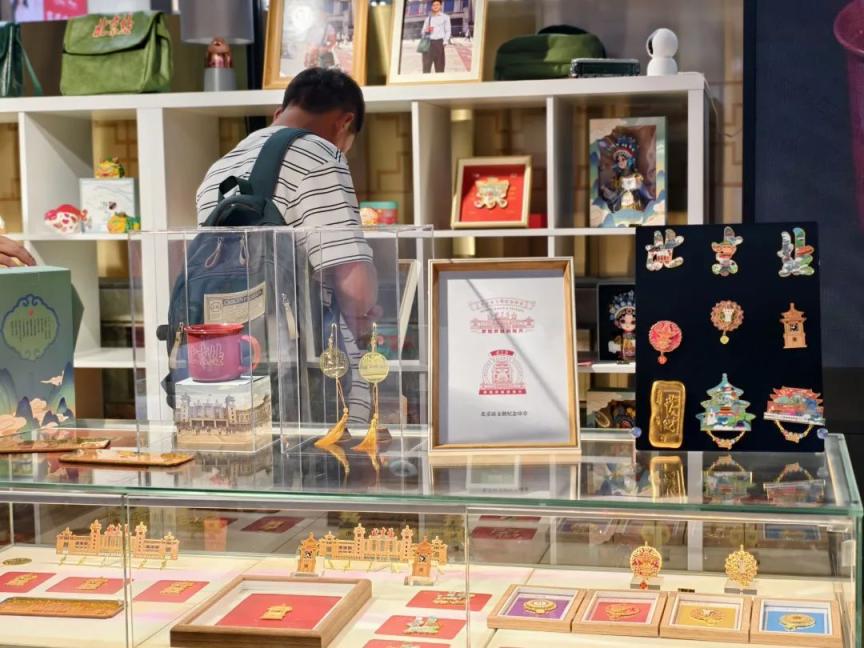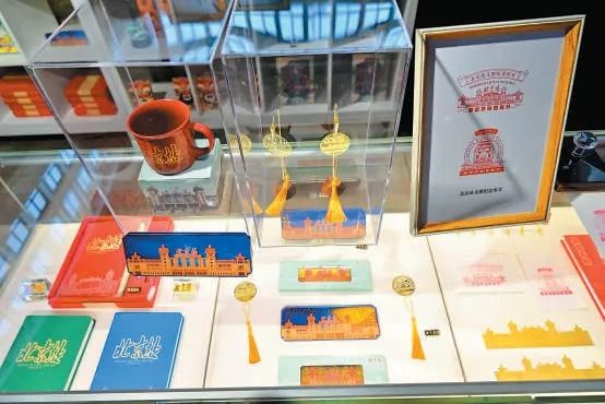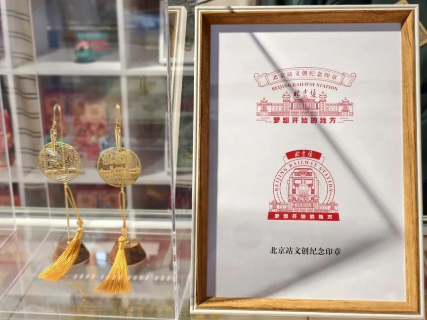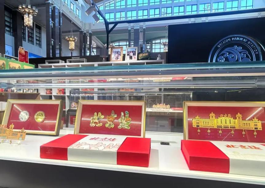 走进售卖区,一排排文创产品琳琅满目、京味儿满满。一款“北京站”字样的冰箱贴造型精致,设计富有巧思,融入了毛泽东号机车、北京站建筑、长城、中轴线、大运河文化带、北京城市副中心站等北京城市元素;一款以北京站标志性书法为主题的金属徽章十分吸睛,承载着北京站独特的艺术韵味;一款以金色“北京站”笔体为主题的马克杯造型复古,兼具实用性与艺术性。此外,还有手工绢人盲盒、纸雕灯笼、邮差复古包等“北京礼物”供旅客选择。