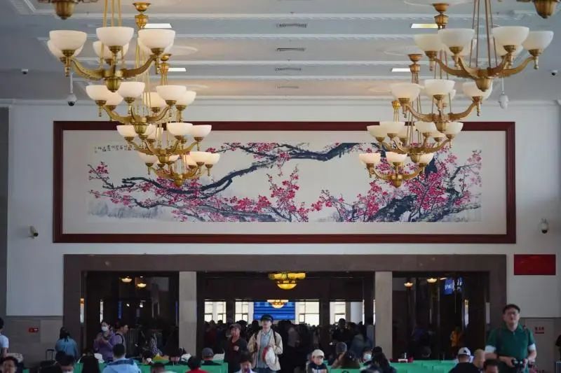 除了文创产品,6幅名家画作也在北京站新挂上墙。包括古一舟、溥松窗绘制的《拒马河畔大寨花》、陶一清先生巨幅画作《锦绣河山》、霍春阳的《报春图》、马广文的《腊梅》等。“一进候车室,就能感受到扑面而来的文艺气息。”假期打算去秦皇岛度假的周先生在《报春图》前驻足欣赏,还用手机定格下一幅幅画作的艺术美。